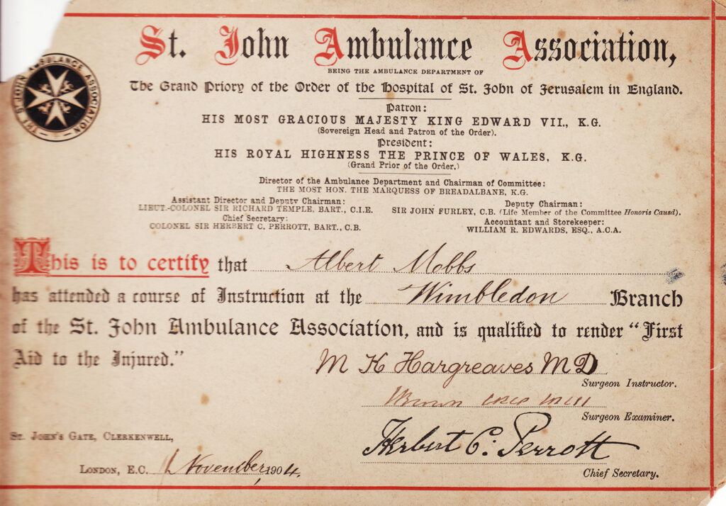 His first aid training certificate, issued in November 1904, is one of the few remaining from King Edward VII’s reign.